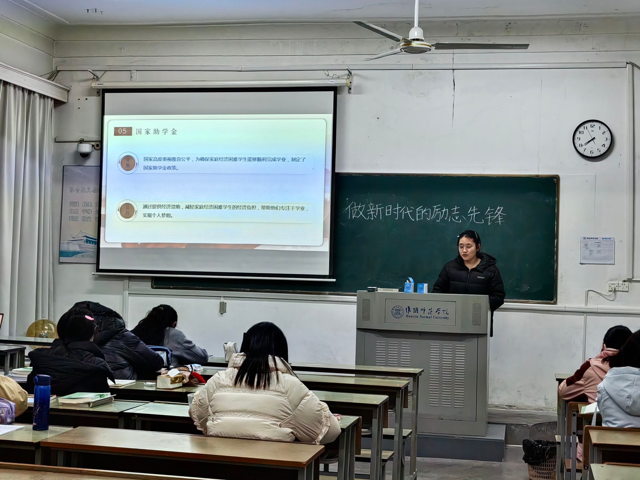 为加大学生资助政策宣传力度,发挥受助学生典型示范和引领作用,推进国家资助政策宣传的广度和深度,深化资助育人作用,今年会网站积极组织国家励志奖学金、泉海奖学金、缘之缘奖学金获奖学生担任学院资助宣传大使,于3月31日走进晚自习教室对学院23级和24级全体学生开展“做新时代的励志先锋”宣讲活动。
