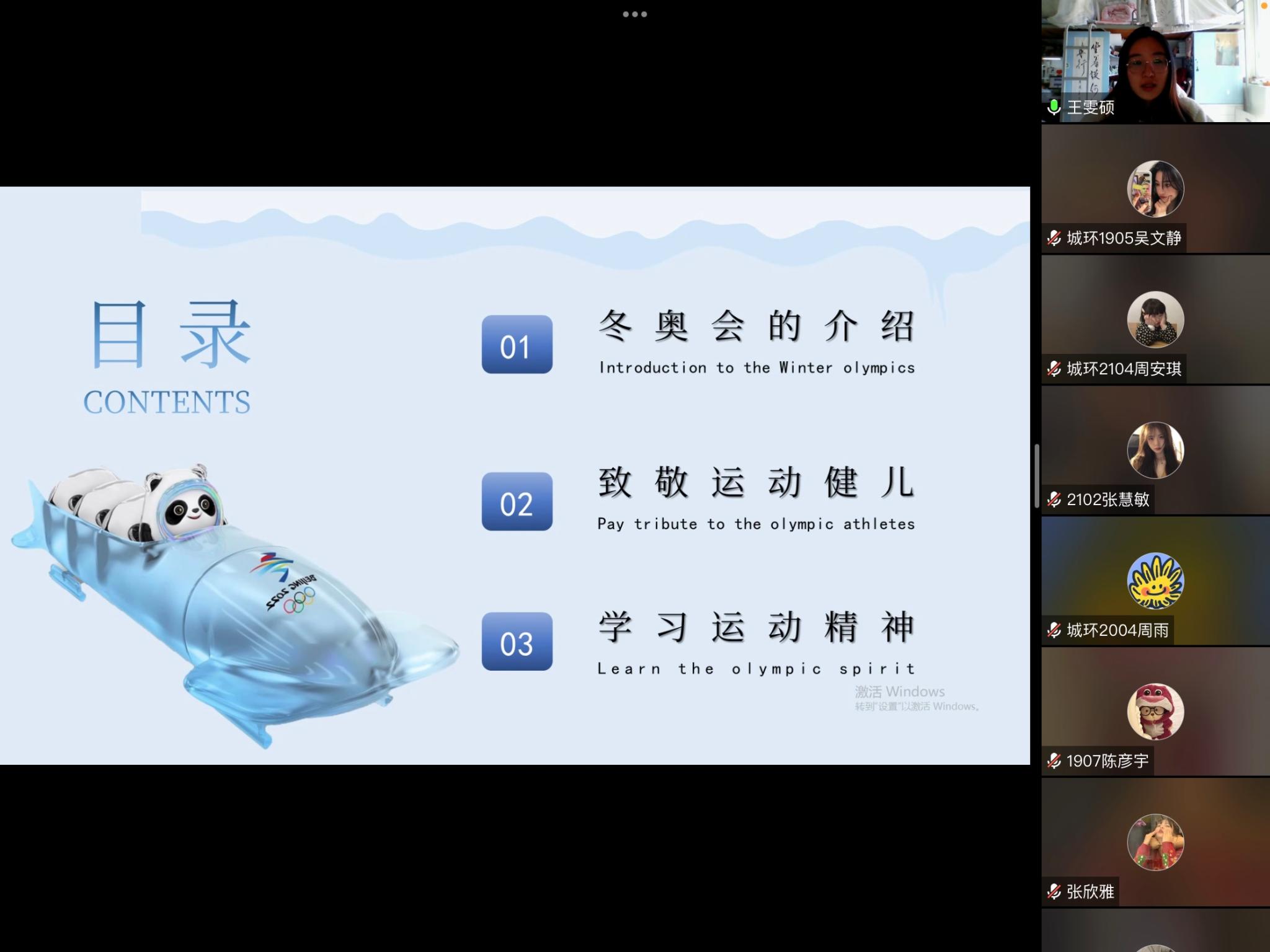 活动由介绍2022北京冬奥会及其申办过程,致敬运动健儿,分享回顾比赛夺冠瞬间的个人感受,学习奥林匹克运动精神等四个部分组成。活动伊始,王雯硕向同学们介绍到北京2022年冬奥会共设7个大项、15个分项和109个小项,其中新增7个比赛小项。此外,北京冬奥会是中国体育代表团史上参赛规模最大的一届。随后,她带领同学们回顾本届冬奥会运动健儿的精彩夺冠瞬间,致敬各种竞技体育赛事的运动健儿。了解了努力且自信的优秀运动员谷爱凌;德国著名速滑女运动员克劳迪娅佩希施泰等。