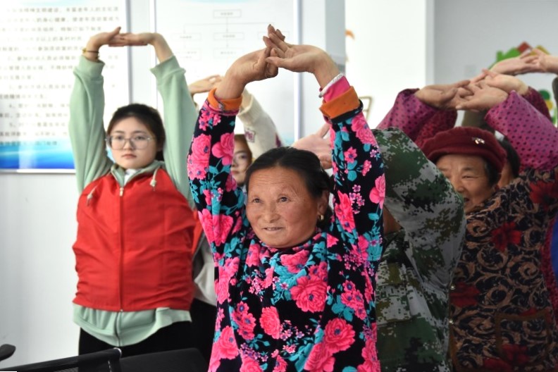 图为志愿者带领老人练习养生操。记者 陈洲仪 摄