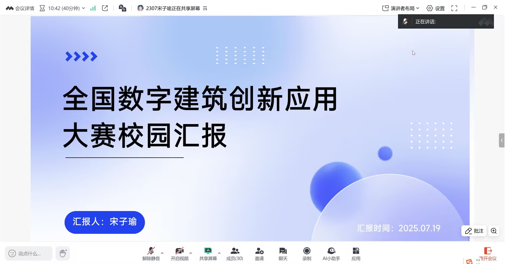 为全国数字建筑创新应用大赛选拔优秀人才,推动建筑数字化领域的人才培养与创新发展,7月19日,全国数字建筑创新应用大赛校园选拔赛如期举行。本次选拔赛采用线上腾讯会议的形式开展,张善凯老师、张洪波老师、陈林老师、周洪英老师、任加锐老师、封海洋老师、张飞老师等多位专业教师出席活动,为赛事提供专业指导与支持。本次活动由副部长宋子瑜主持。