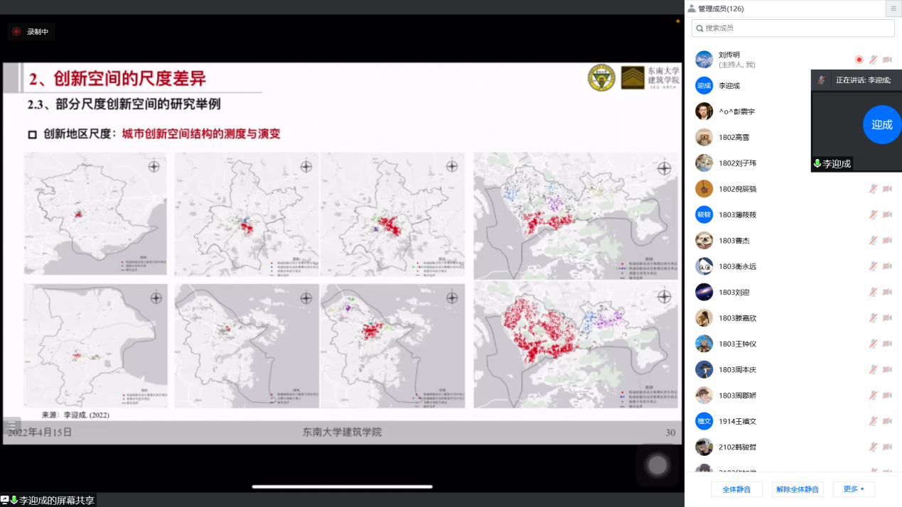 4月15日14:30-17:30,东南大学建筑学院李迎成教授应邀做客第43期淮河论坛,并作题为《创新空间的概念内涵与尺度差异》的学术报告。本次学术报告采用腾讯会议线上模式,城环学院院长毛广雄主持,学院部分师生参会。