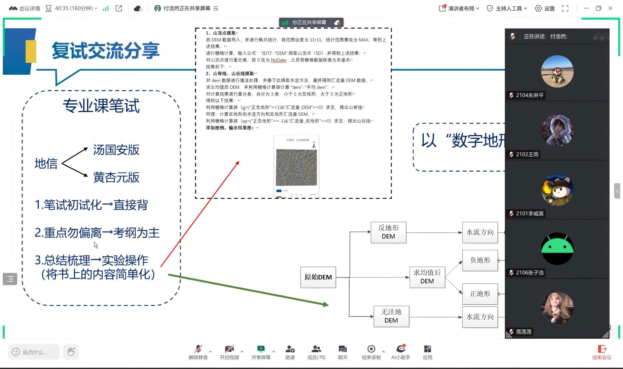 往届毕业生张鹏、吴蕊婷、居旭薇、付浩然4位同学结合就读院校和个人实际,详细介绍了复试流程、复试内容、评分标准以及调剂信息收集、系统支持、录取确认等细节问题。在师生互动答疑环节,同学们踊跃提问,与会老师一一进行专业解答,提出了个性化的备考建议。
