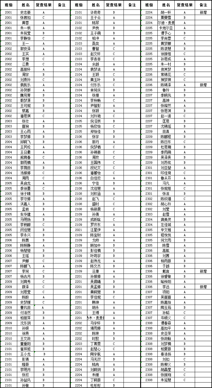 根据《关于做好2023-2024学年家庭经济困难学生资格复查工作的通知》要求,依照《淮阴师范学院家庭经济困难学生认定工作暂行办法》相关规定,学院近期对部分家庭经济困难学生进行的复查,现将复查结果进行公示,公示期为三个工作日,期间如有异议请于学工办张老师联系,电话0517-83525926,0517-83526309。名单如下: