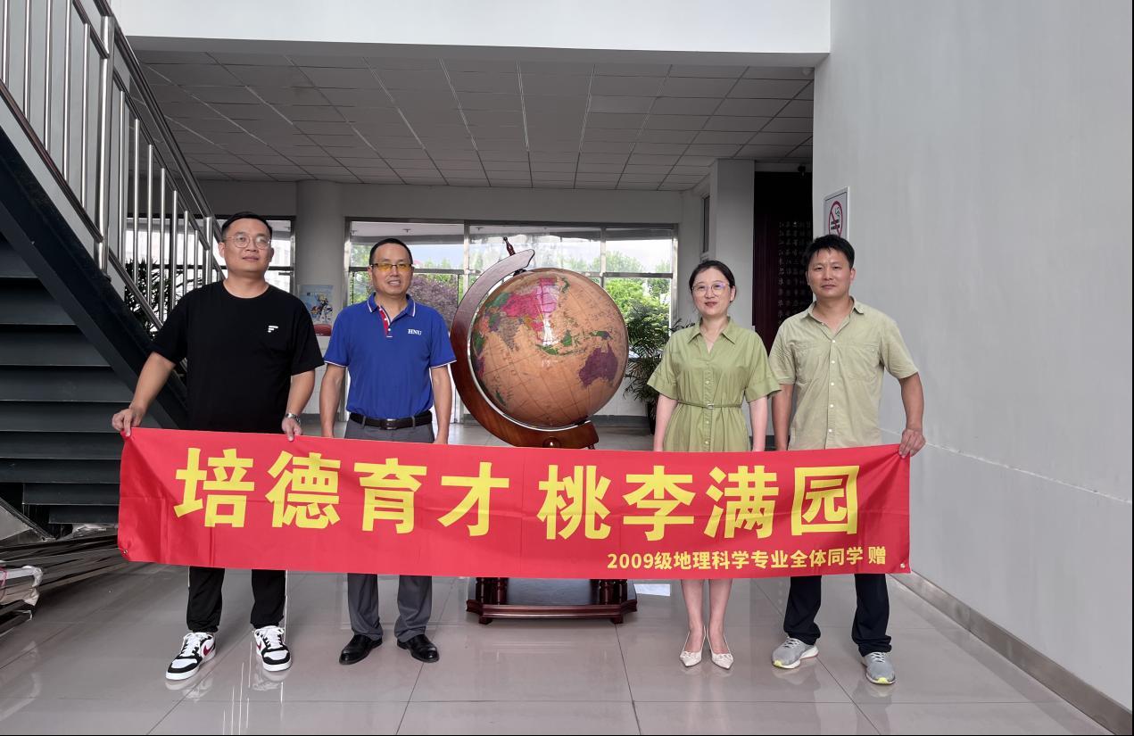 “培德育才、桃李满园”,全体校友为表达对学院精心培养的感激和对学院未来发展的美好祝愿,特捐赠有地理专业特色的“地球仪”,刘传明、曹玉华、和校友代表刘剑、夏炎参加了捐赠仪式并拍照留念。