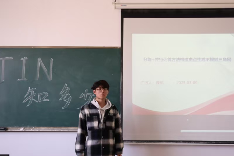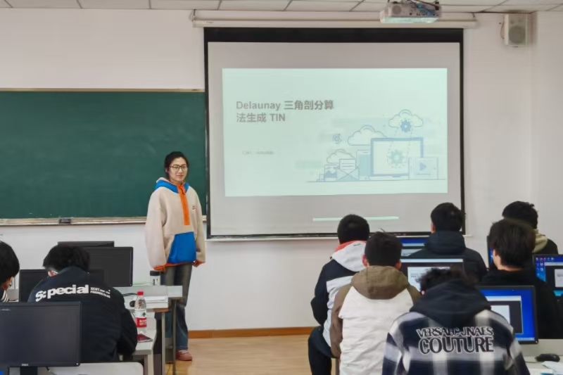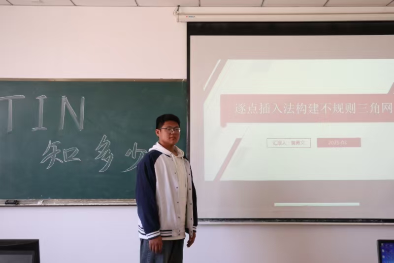 活动伊始,小组组长冯凯旋以“为什么TIN是地形建模的利器?”为引,通过生动案例阐释了TIN的基本原理及其在数字地图、游戏场景建模等领域的应用价值。通过一系列图示,冯凯旋形象地为同学们讲解了最经典的“Delaunay三角剖分算法”,让同学们逐步理解了“空外接圆准则”和“最小角最大化准则”。