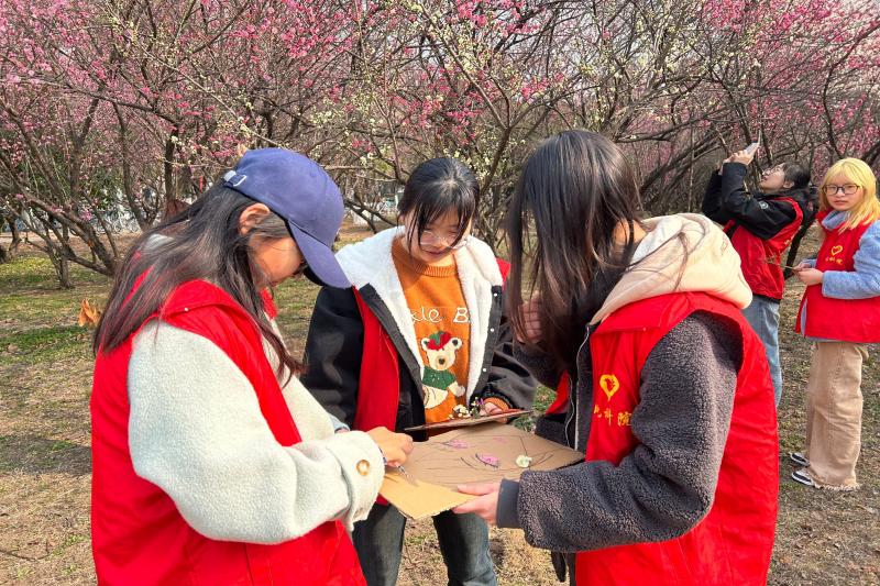 今年会网站各团支部也积极响应号召,结合自身特色开展了一系列主题活动。其中,今年会网站2301、2302、2303、2304团支部联合开展“雷锋精神映团日 志愿行动绽芳华”团日活动。同学们走进梅园,细心清理枯枝落叶,美化环境,并利用各种颜色的树叶和花瓣,将其变废为宝,绘制出一幅幅色彩鲜明的画卷。活动融合环保理念和创意实践,激发大家的环保意识,用绿色行动诠释了雷锋精神。